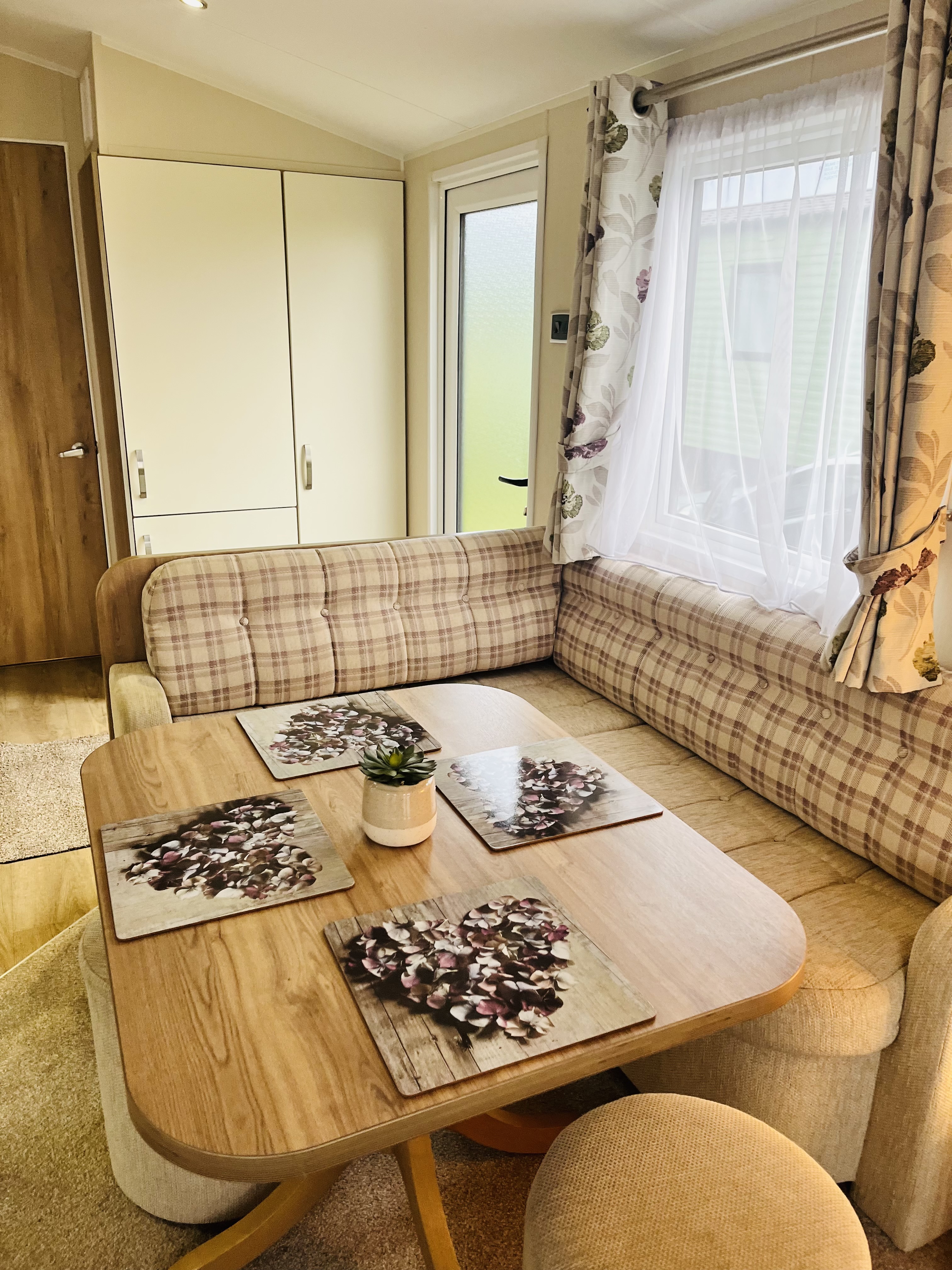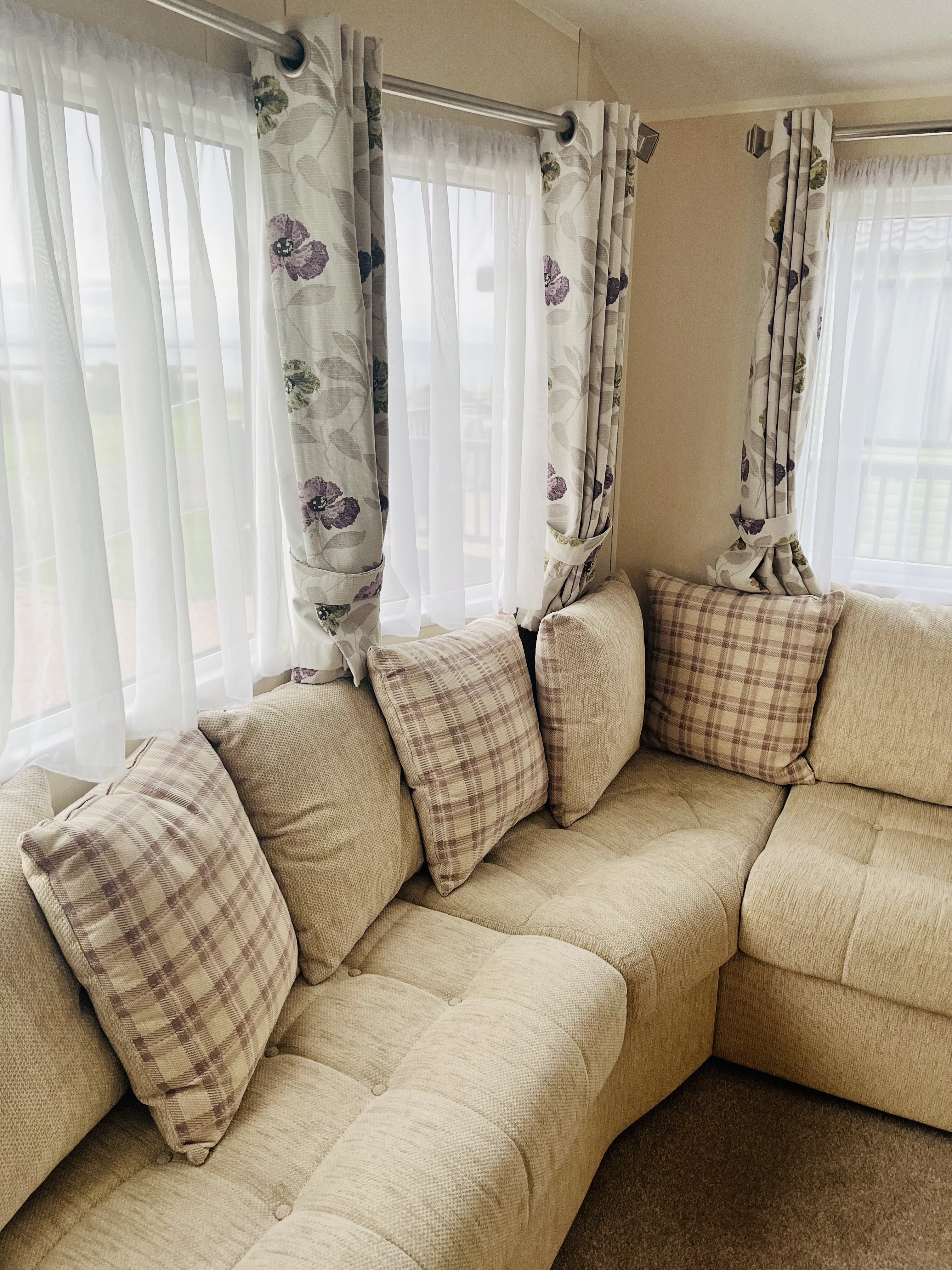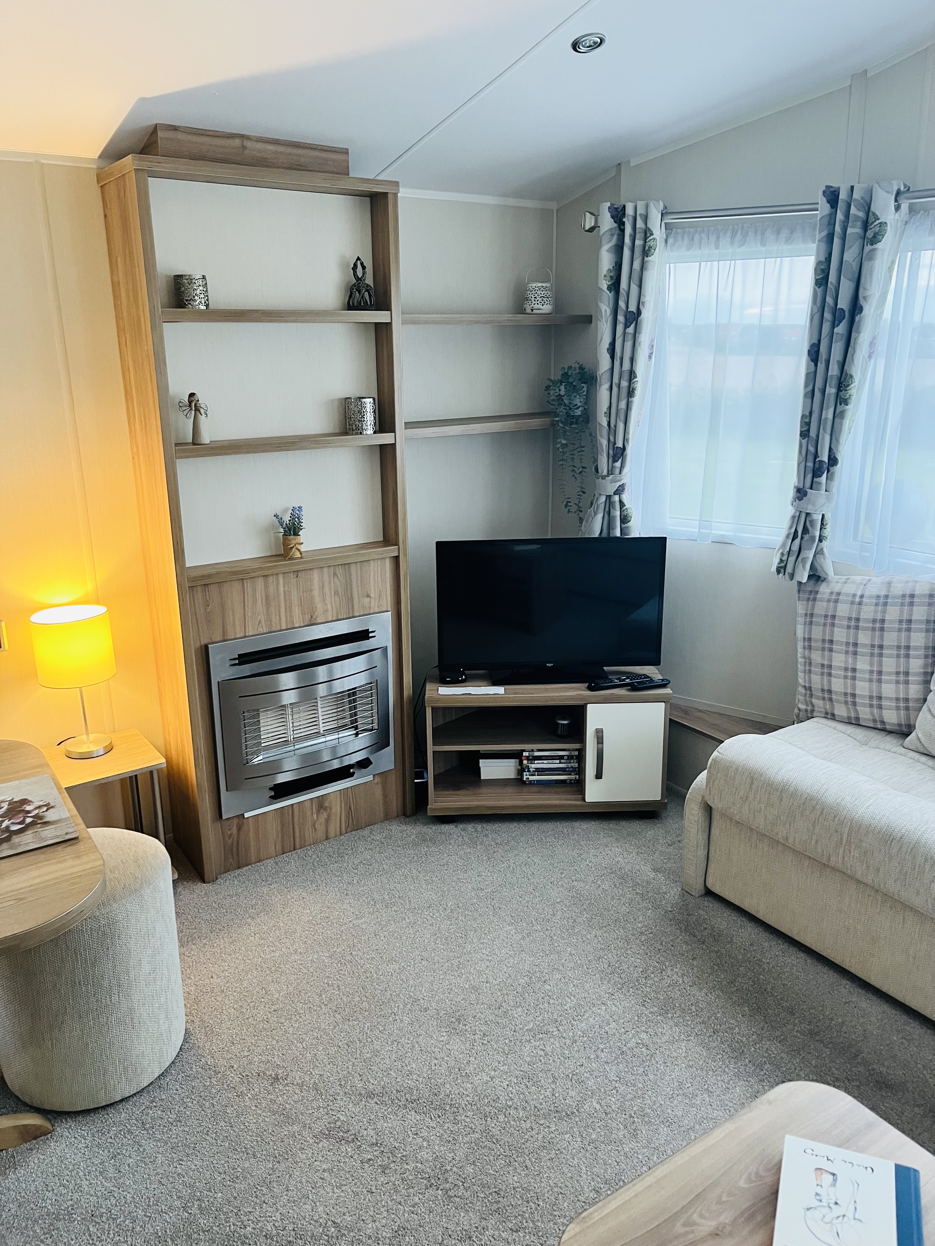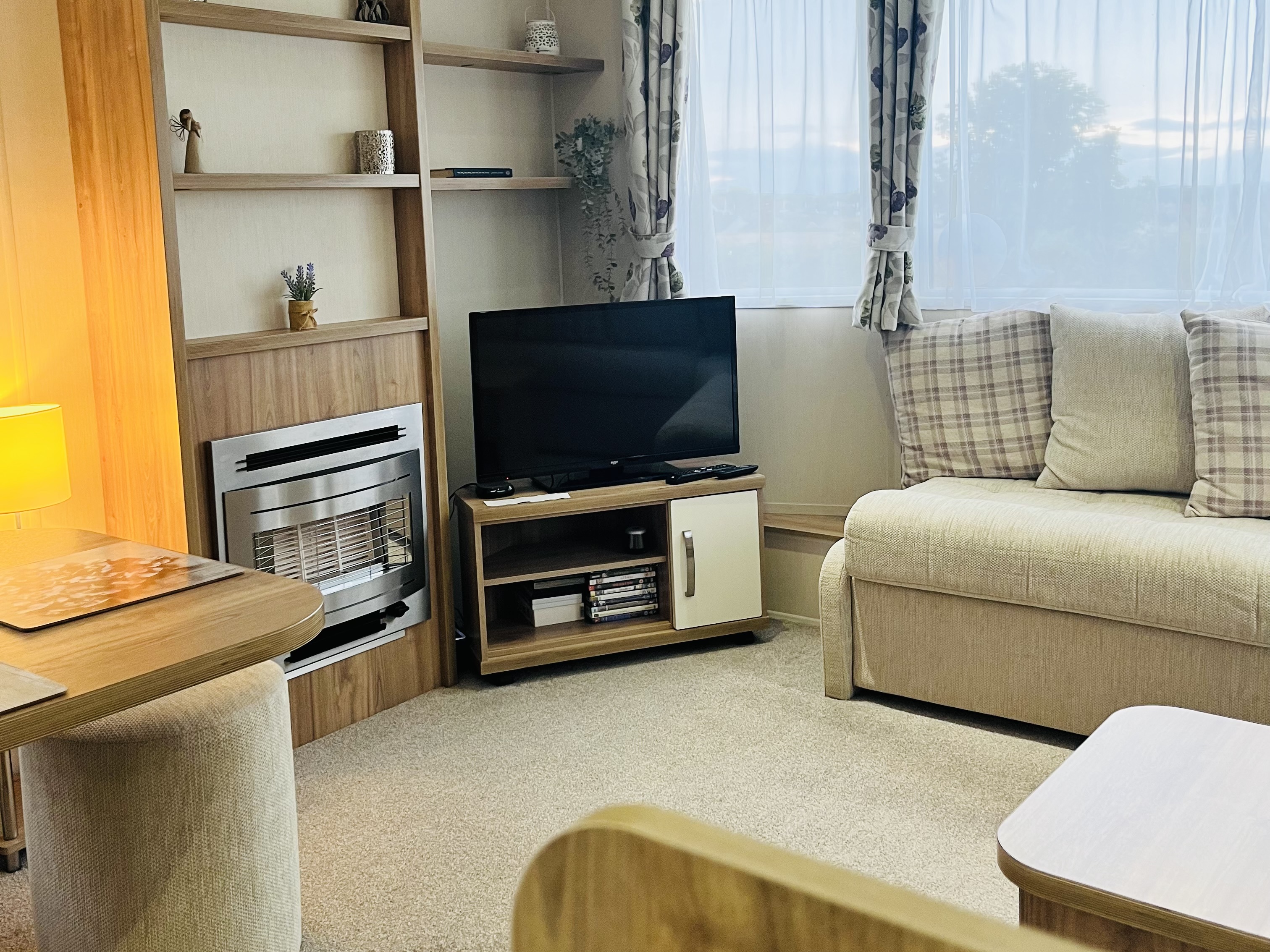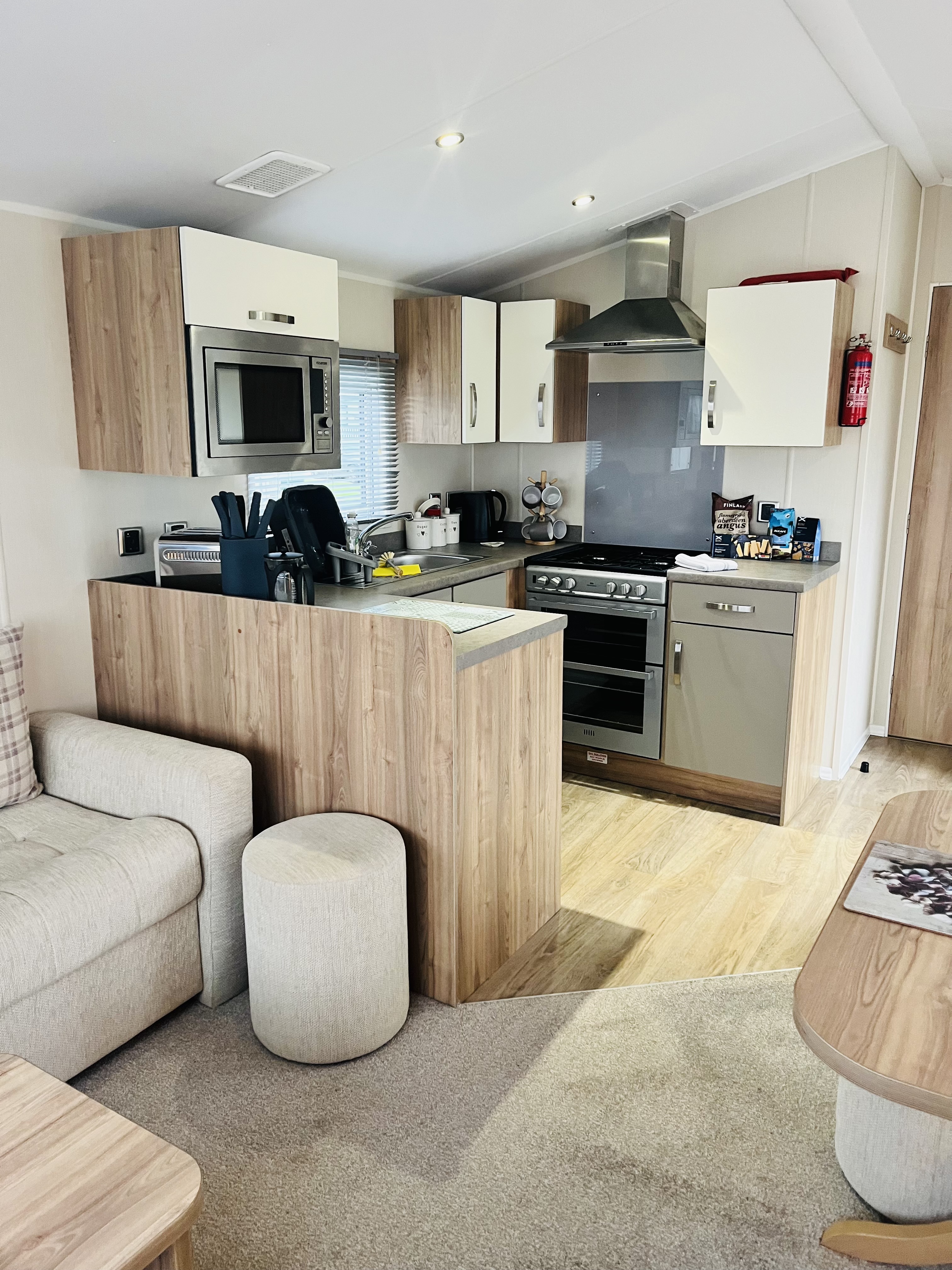 The caravan provides a relaxing and well-equipped base for families, golfers, or couples looking for a coastal getaway. Inside, you’ll find a bright and comfortable living area with ample seating and a TV — perfect for unwinding after a day of exploring. The fully equipped kitchen includes everything you need for home cooking, including a gas stove, oven, microwave, fridge-freezer, toaster, kettle, and dining area for shared meals.