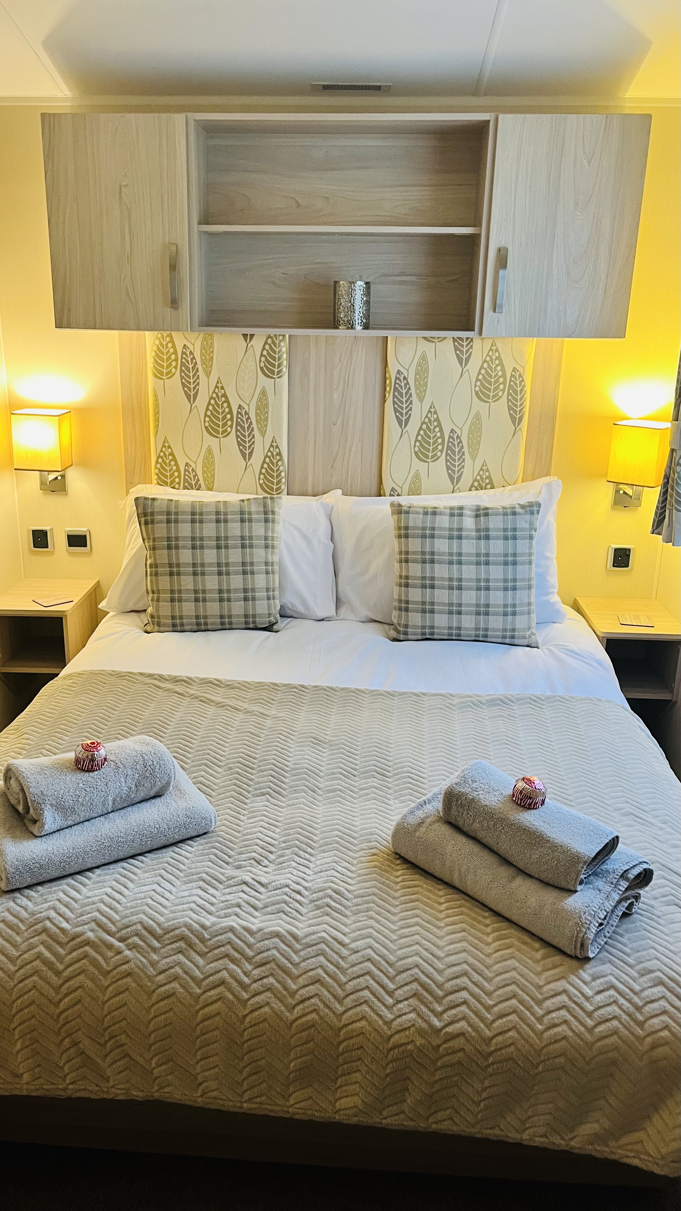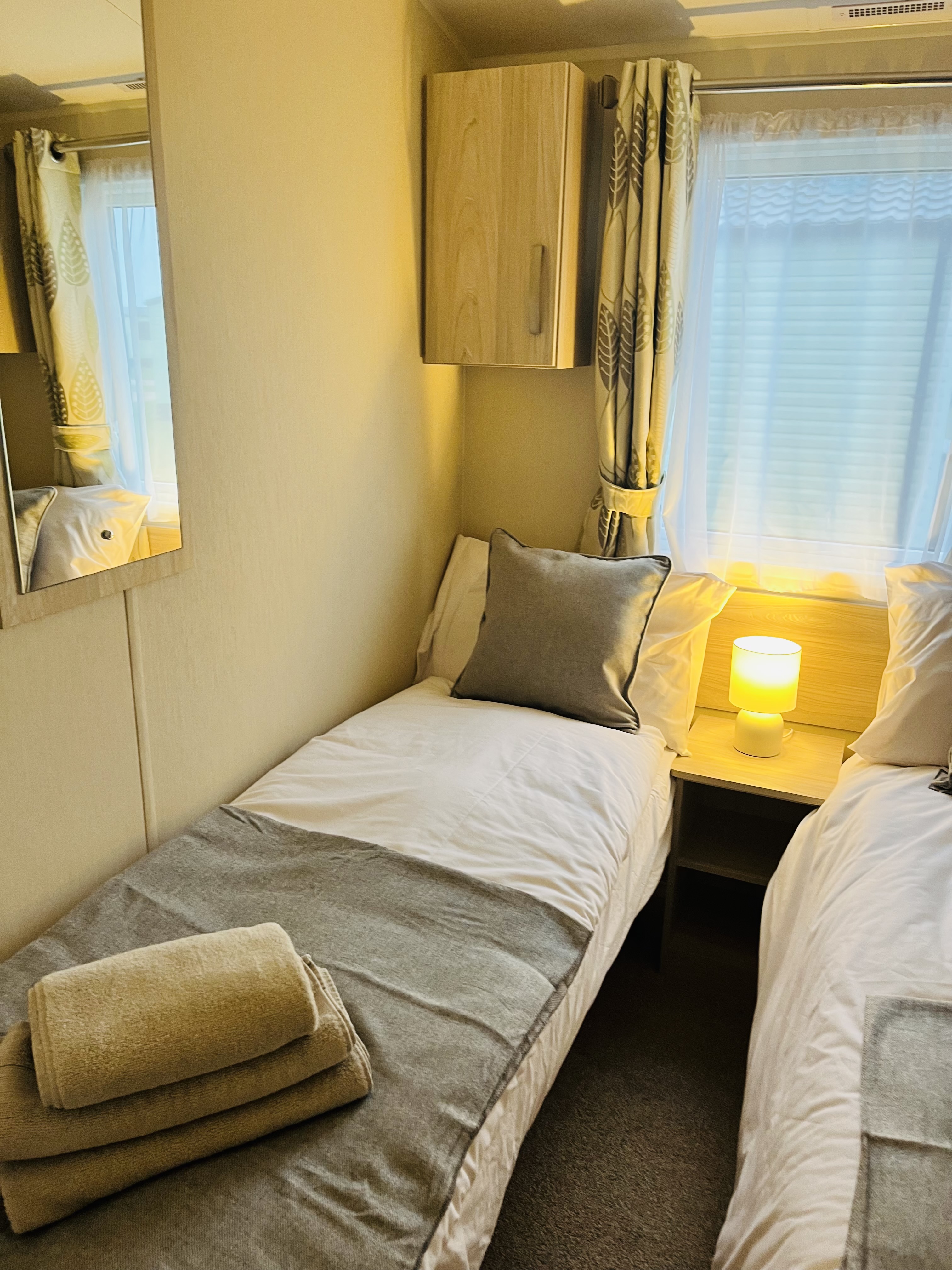 There are three bedrooms: one double and two twin rooms. The twin beds are best suited for children or smaller adults, but can also be pushed together to form a double, comfortably accommodating up to four adults. The caravan includes a modern shower room and a separate WC for added convenience.