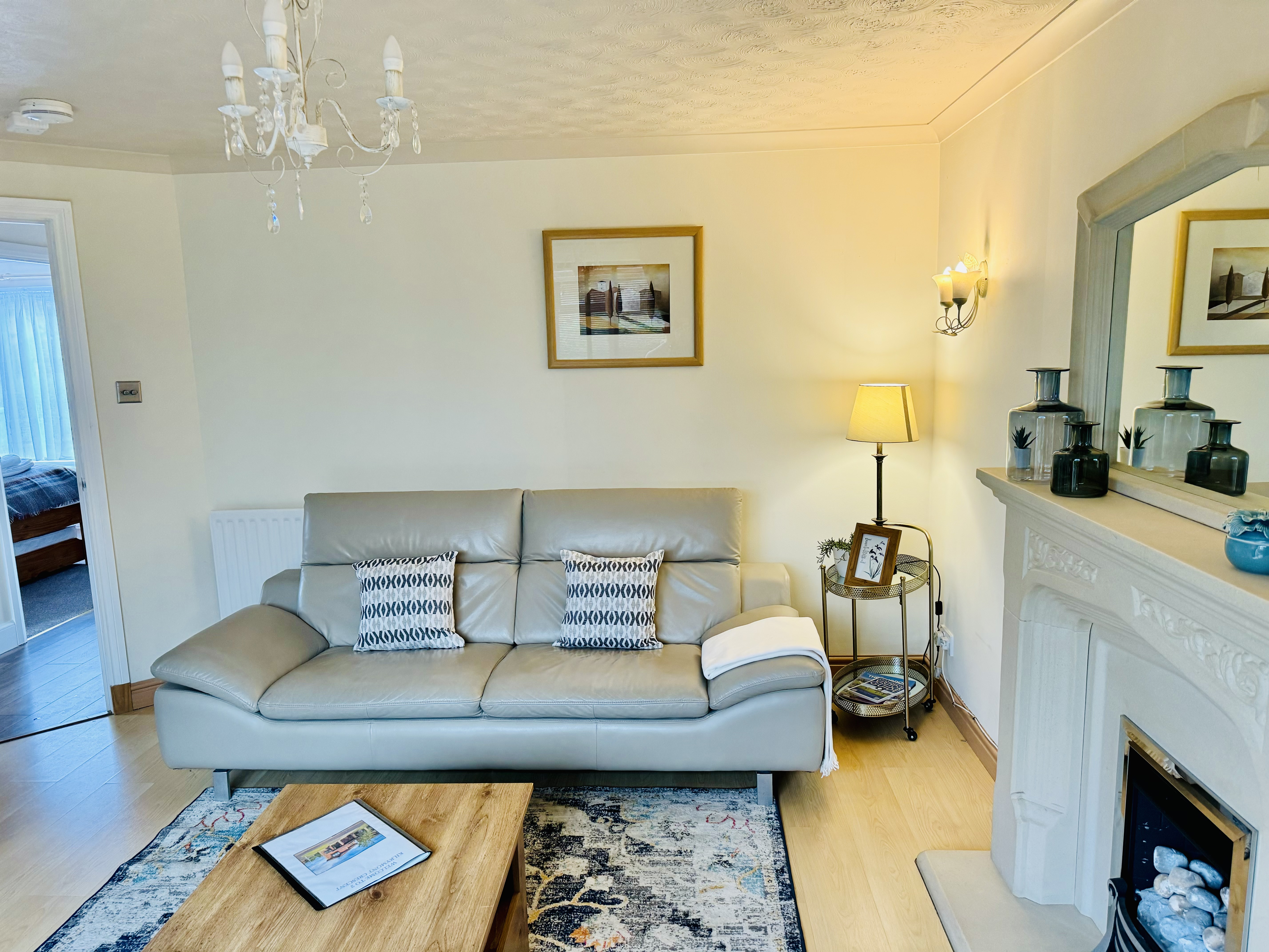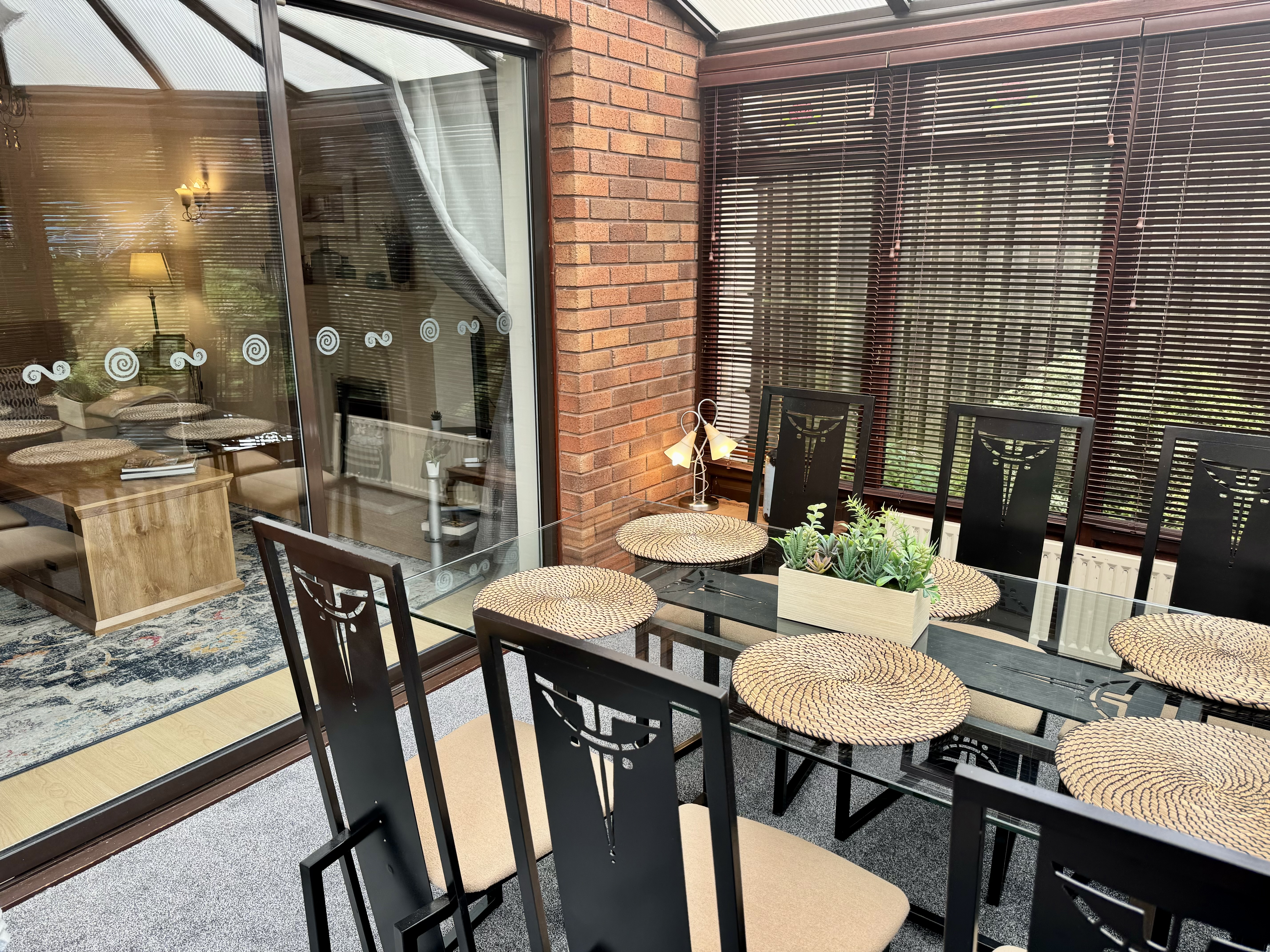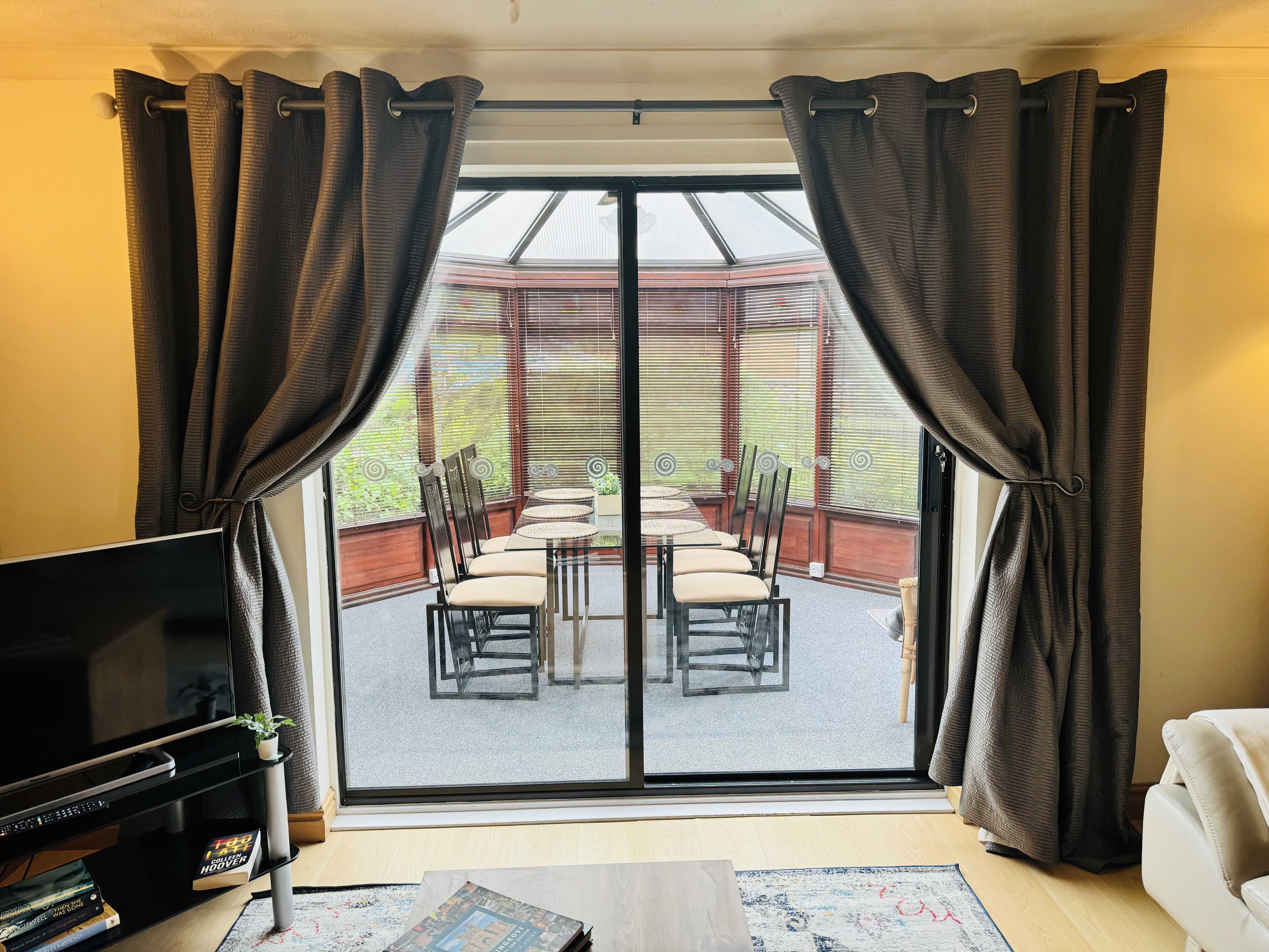The modern, fully equipped kitchen sits to the rear of the property and has direct access to the secure, south-facing garden. The bright and spacious lounge offers plenty of comfortable seating — a great place for everyone to relax after a day of golfing, sightseeing, shopping, or simply enjoying St Andrews. Sliding doors lead to a large conservatory with dining space for up to eight guests, opening onto the lawned garden with decking, outdoor furniture, and a barbecue for guest use.