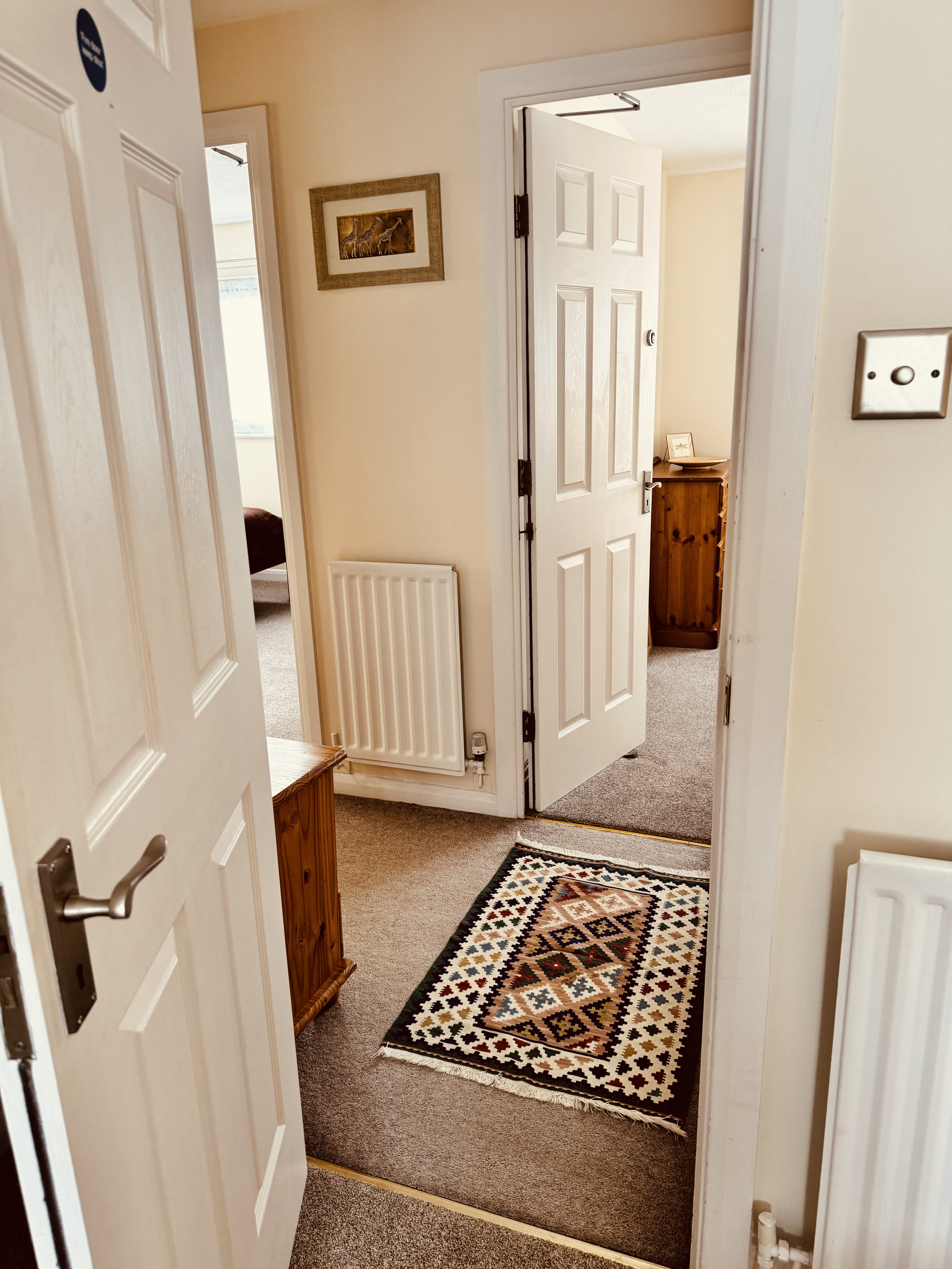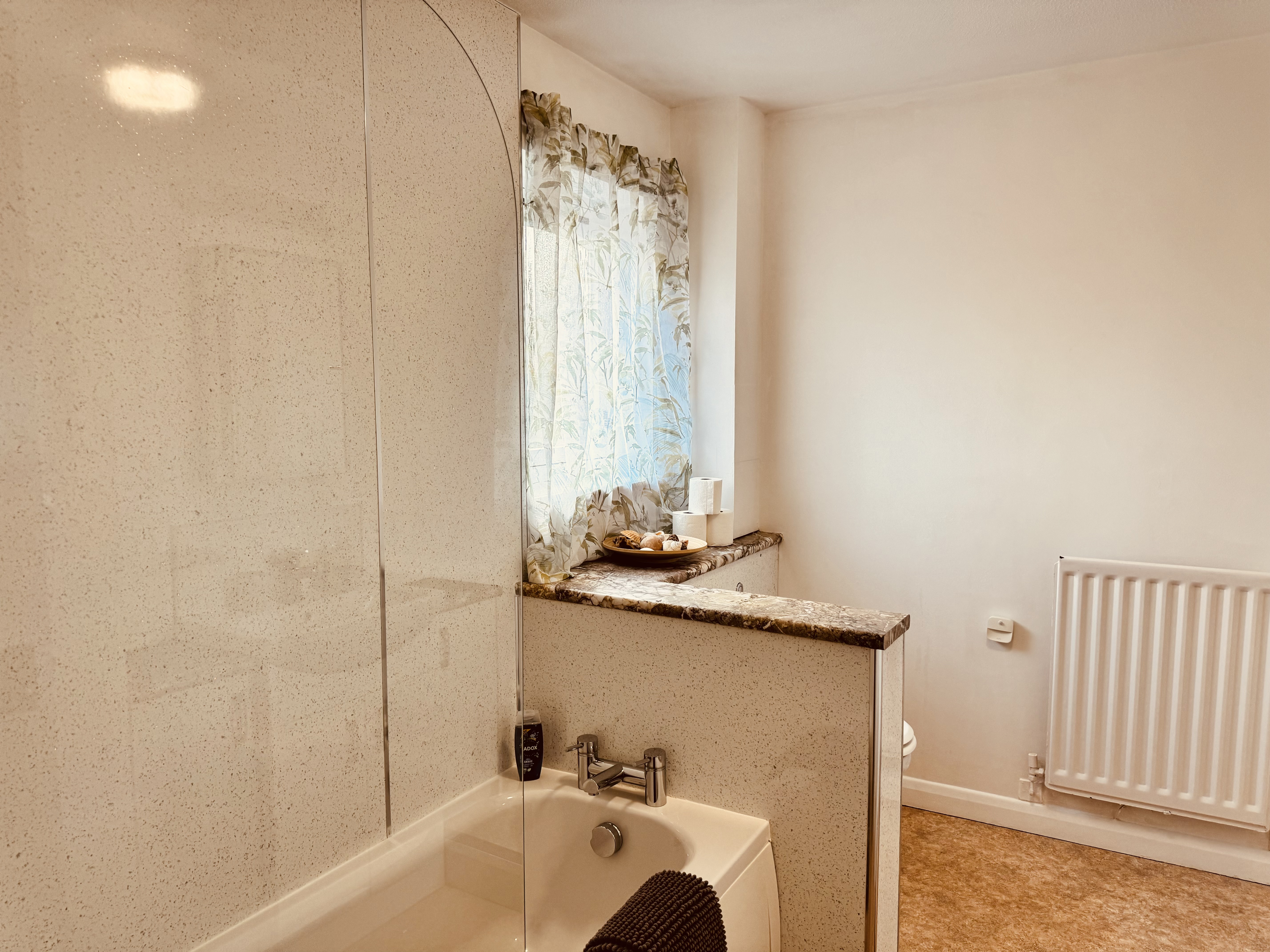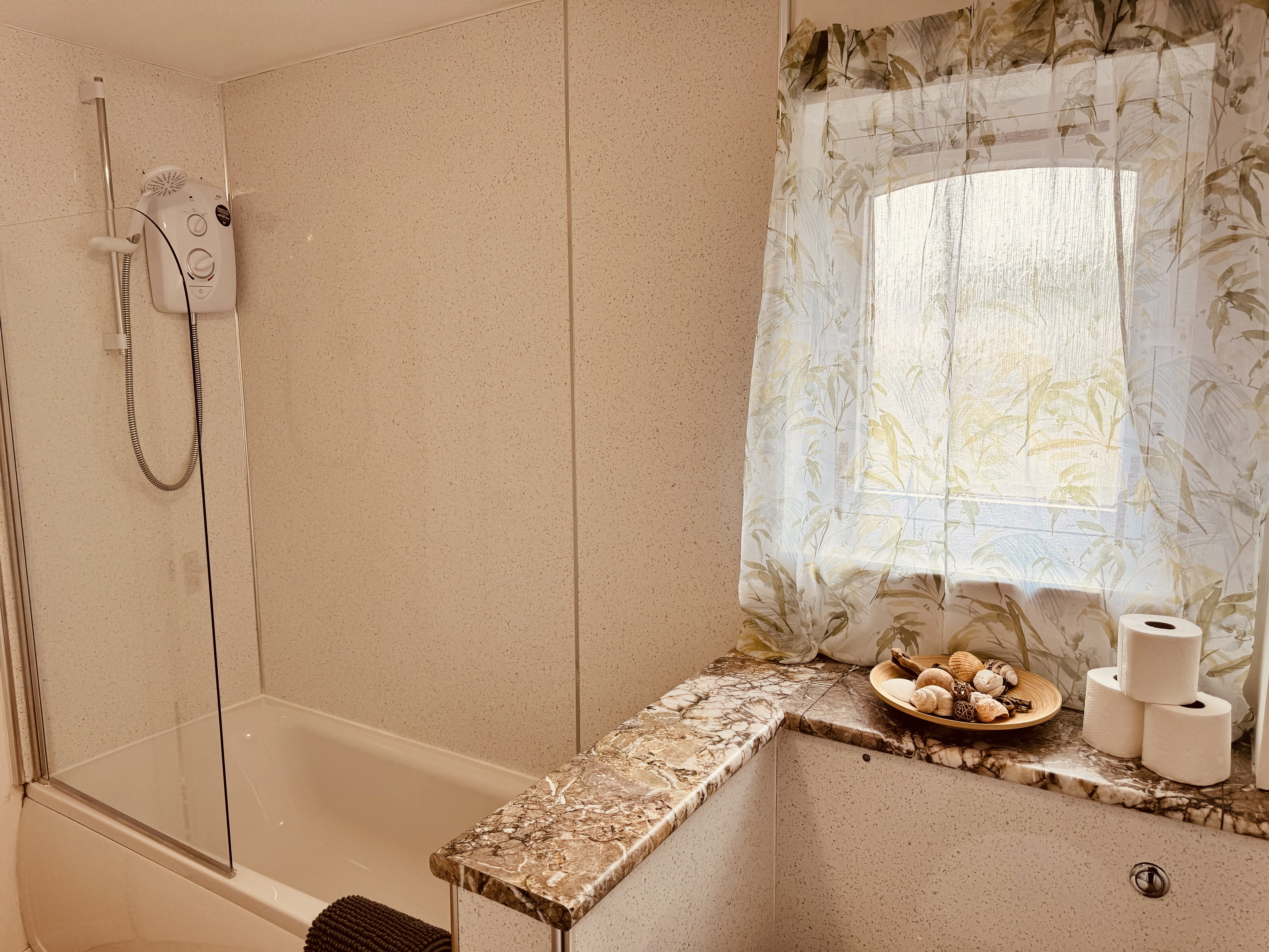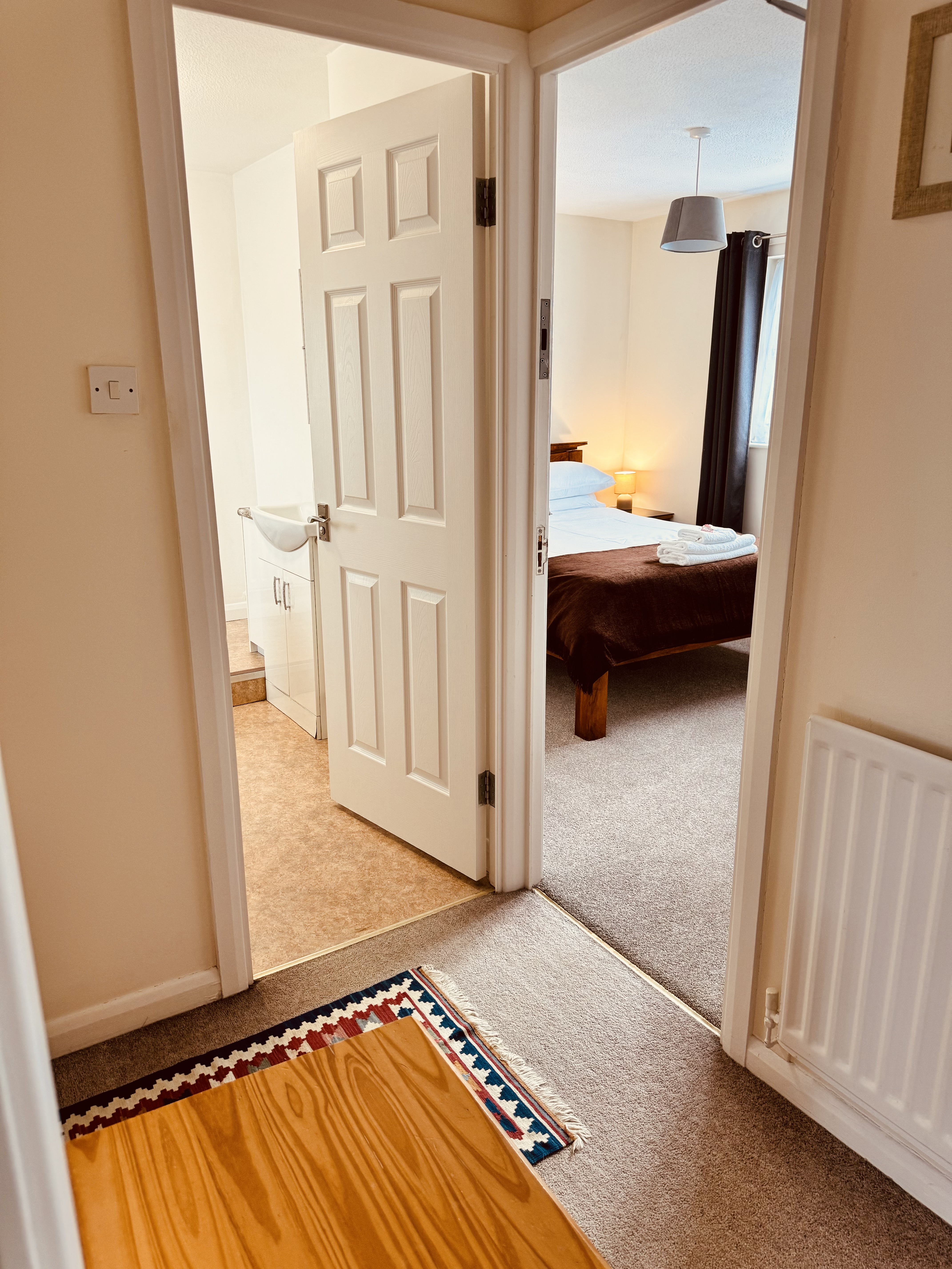 The house features four comfortable bedrooms. Three of the bedrooms are located on the first floor, all with double beds and built-in storage, including a master bedroom with its own ensuite shower room. A generous family bathroom with an over-bath shower serves the remaining bedrooms on this floor. The fourth bedroom is on the ground floor and can be configured as a single or expanded into a king-size using the trundle bed — perfect for flexible group or family arrangements. A convenient WC is also located on the ground floor.