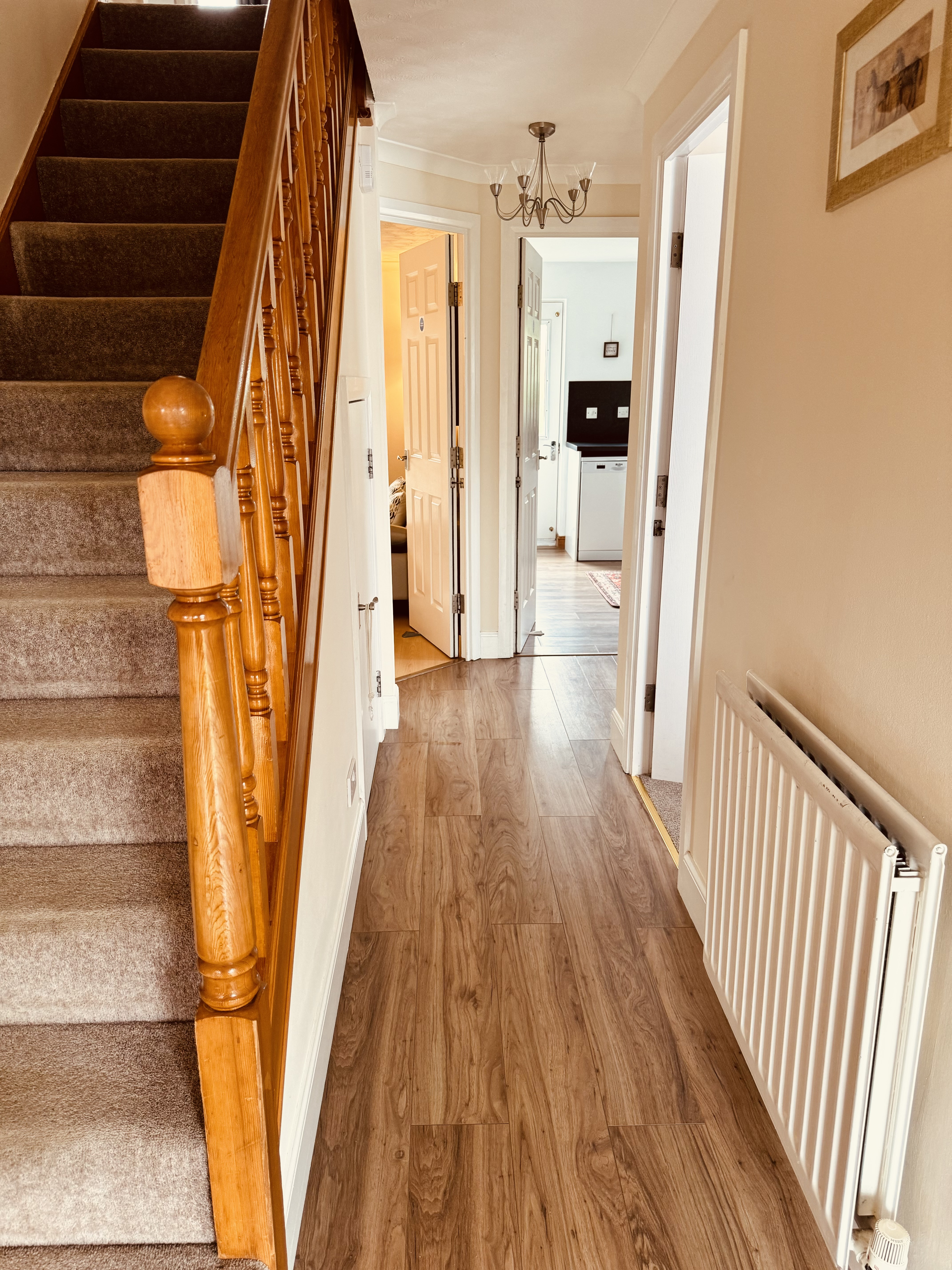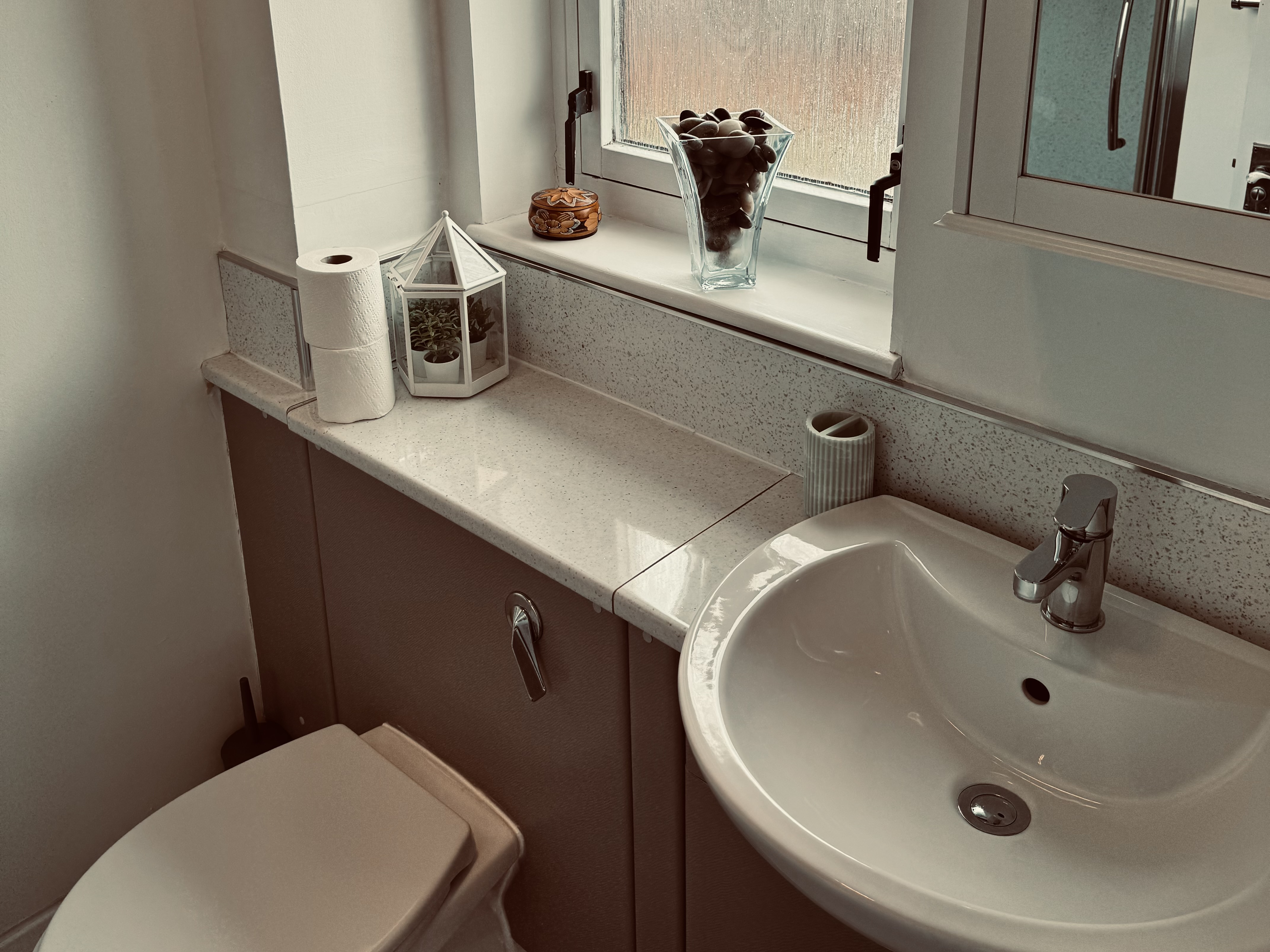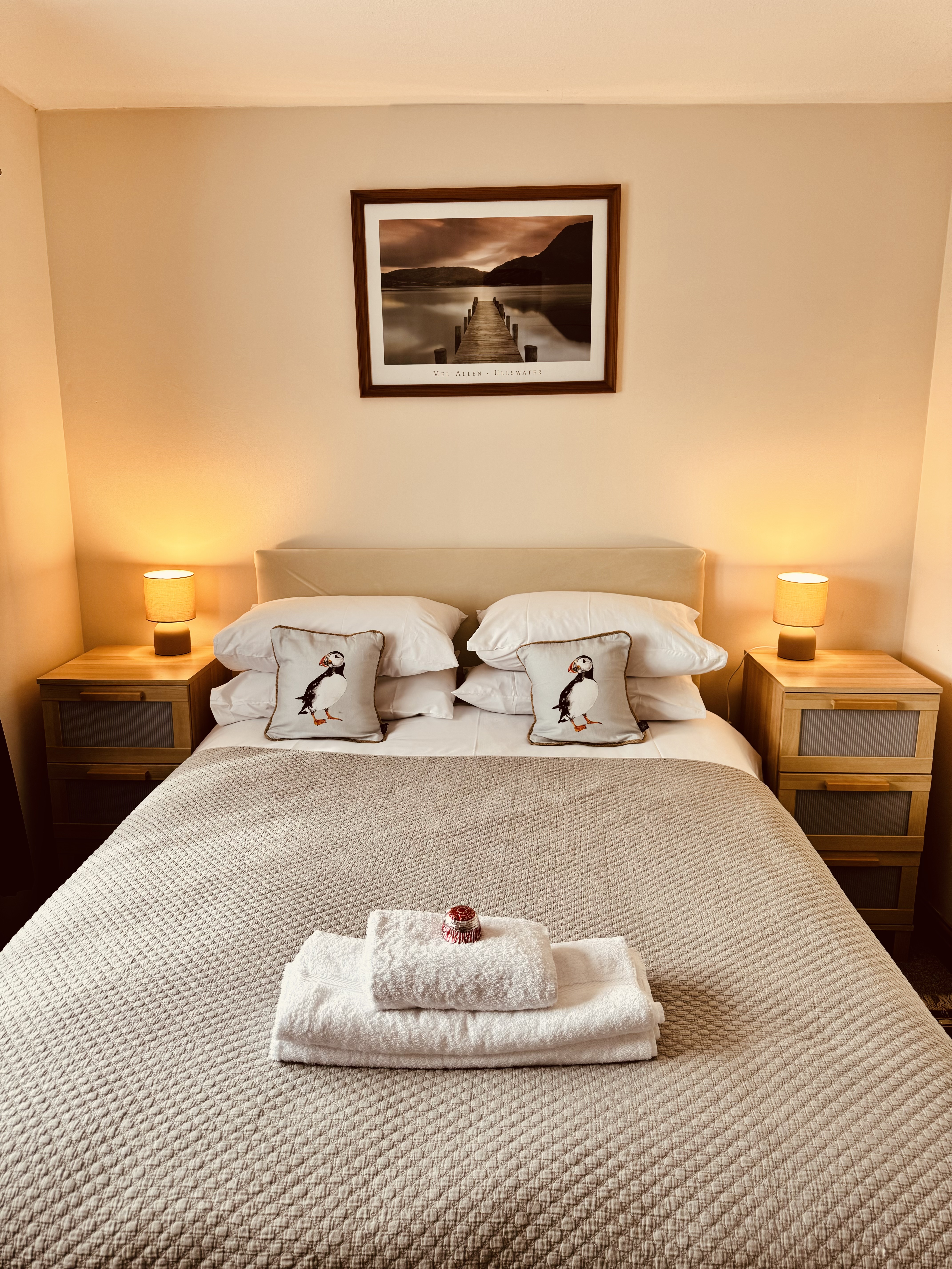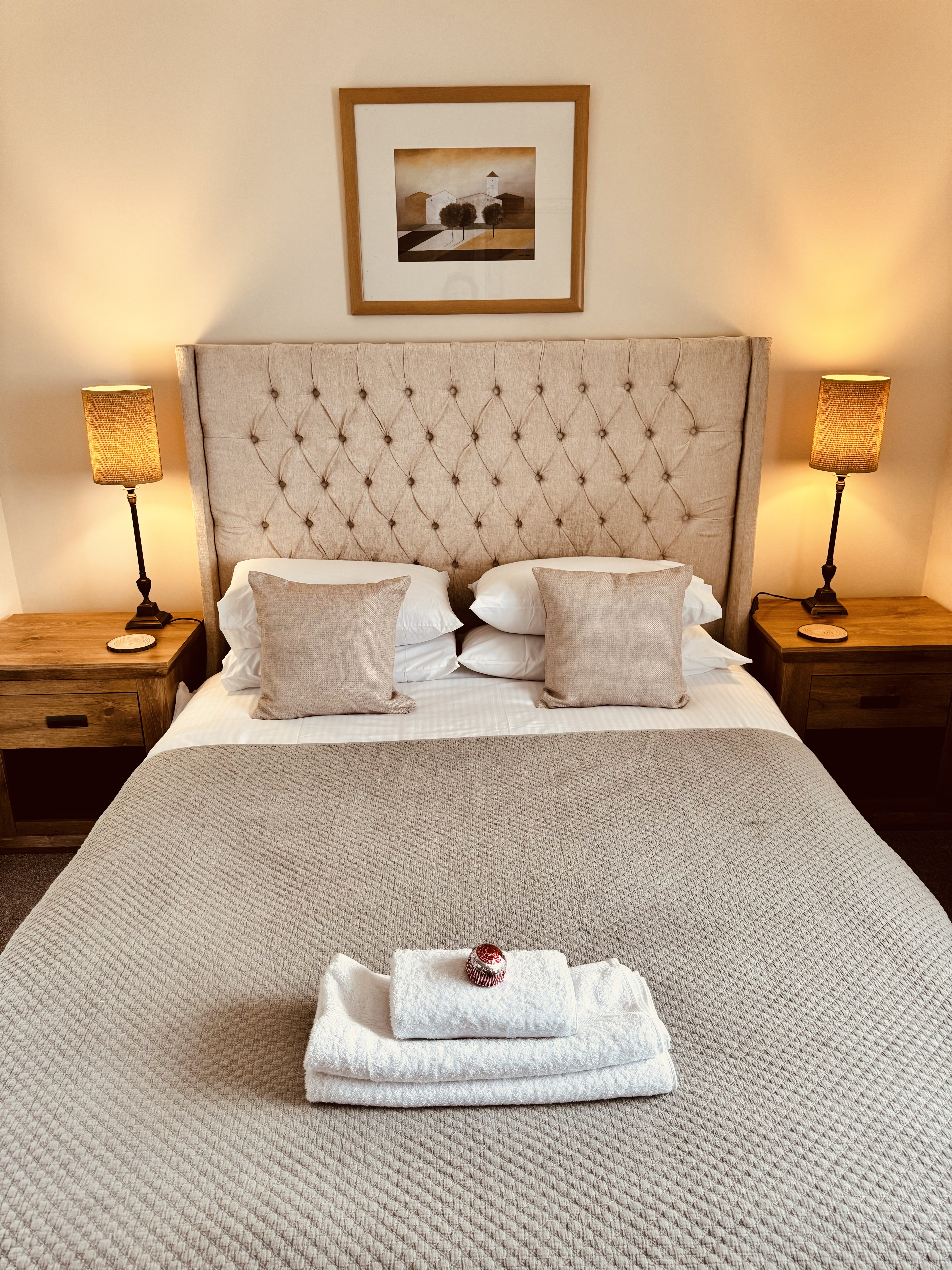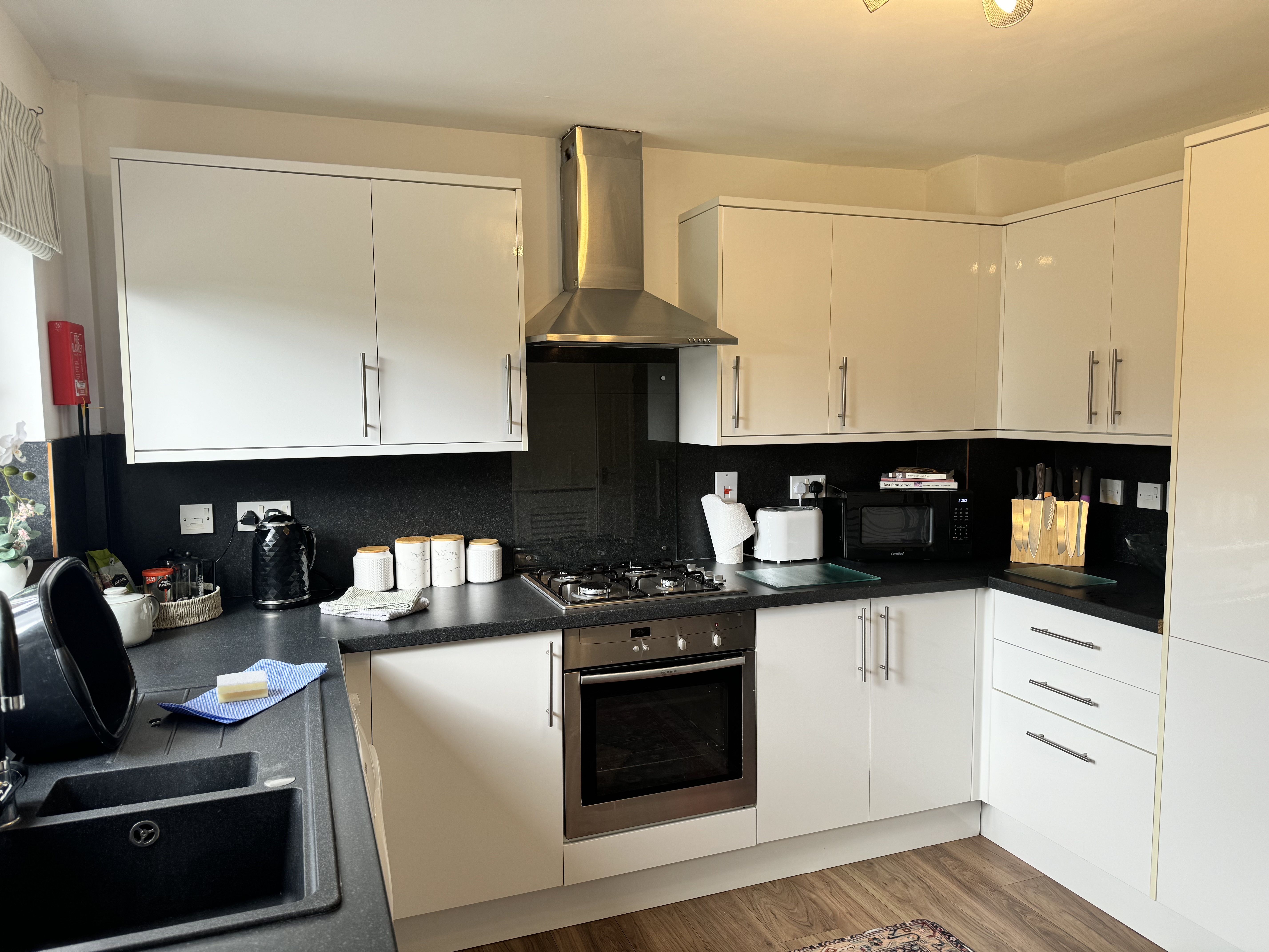 The house features four comfortable bedrooms. Three of the bedrooms are located on the first floor, all with double beds and built-in storage, including a master bedroom with its own ensuite shower room. A generous family bathroom with an over-bath shower serves the remaining bedrooms on this floor. The fourth bedroom is on the ground floor and can be configured as a single or expanded into a king-size using the trundle bed — perfect for flexible group or family arrangements. A convenient WC is also located on the ground floor.