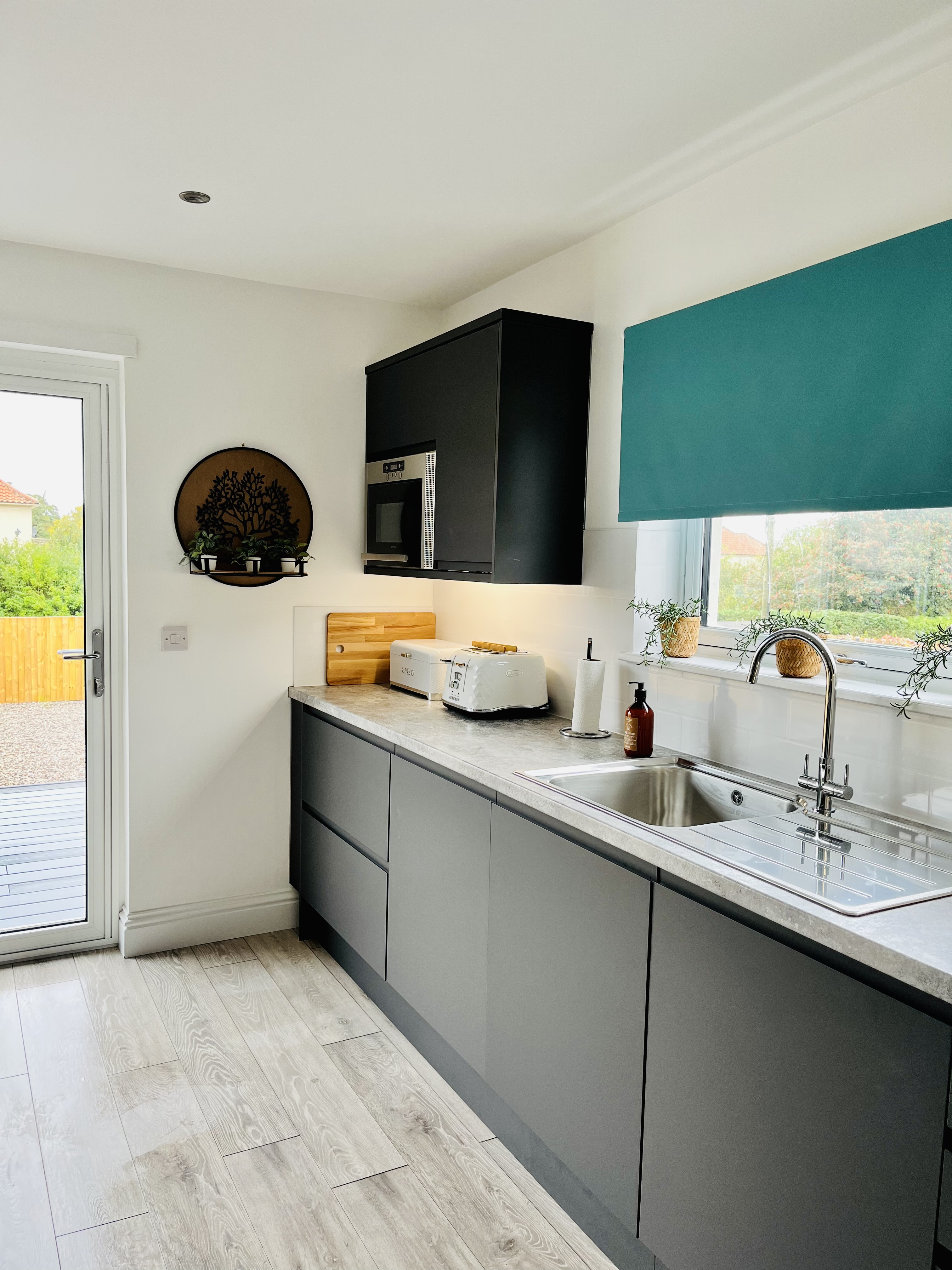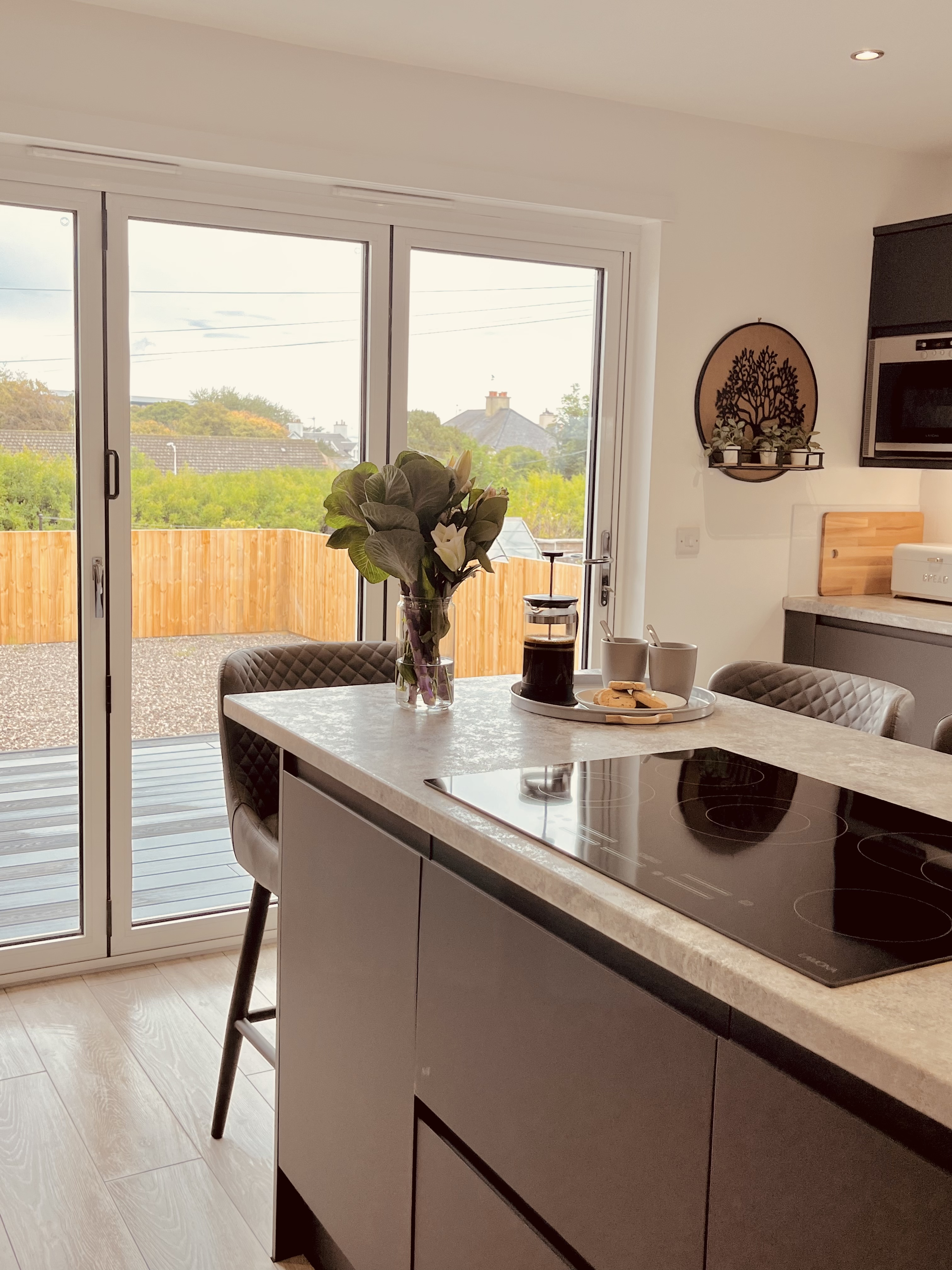 Inside, Mar House welcomes you through a bright, sunny porch and into a spacious open-plan living area. The comfortable lounge features reclining chairs and a 52-inch Smart TV with all your favourite apps. The quirky dining space flows into a large, fully equipped kitchen with modern appliances and another Smart TV — perfect for relaxed mornings at the breakfast bar. Wall-length bi-fold doors open onto a raised composite deck, where you can sit back and enjoy the sunshine, the garden finished with decorative stones and lush foliage.